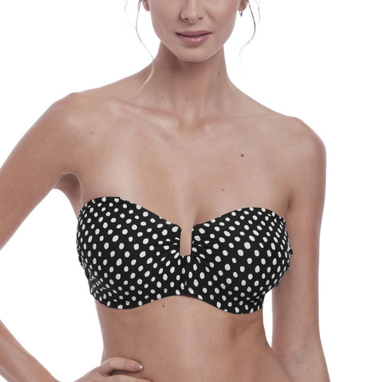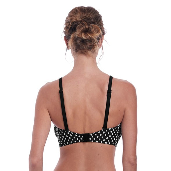Regular price $42.47This chic, monochromatic bikini top from Fantasie will pair perfectly with the matching Santa Monica briefs. Textured Spanish pique fabric with a black and white polka dot print is ever so flattering. The bikini features a plunging neckline which flatters the bust, with a concealed underwire, powernet wings and lined cups for support. The straps are adjustable and able to be worn crossed or straight over the shoulder.