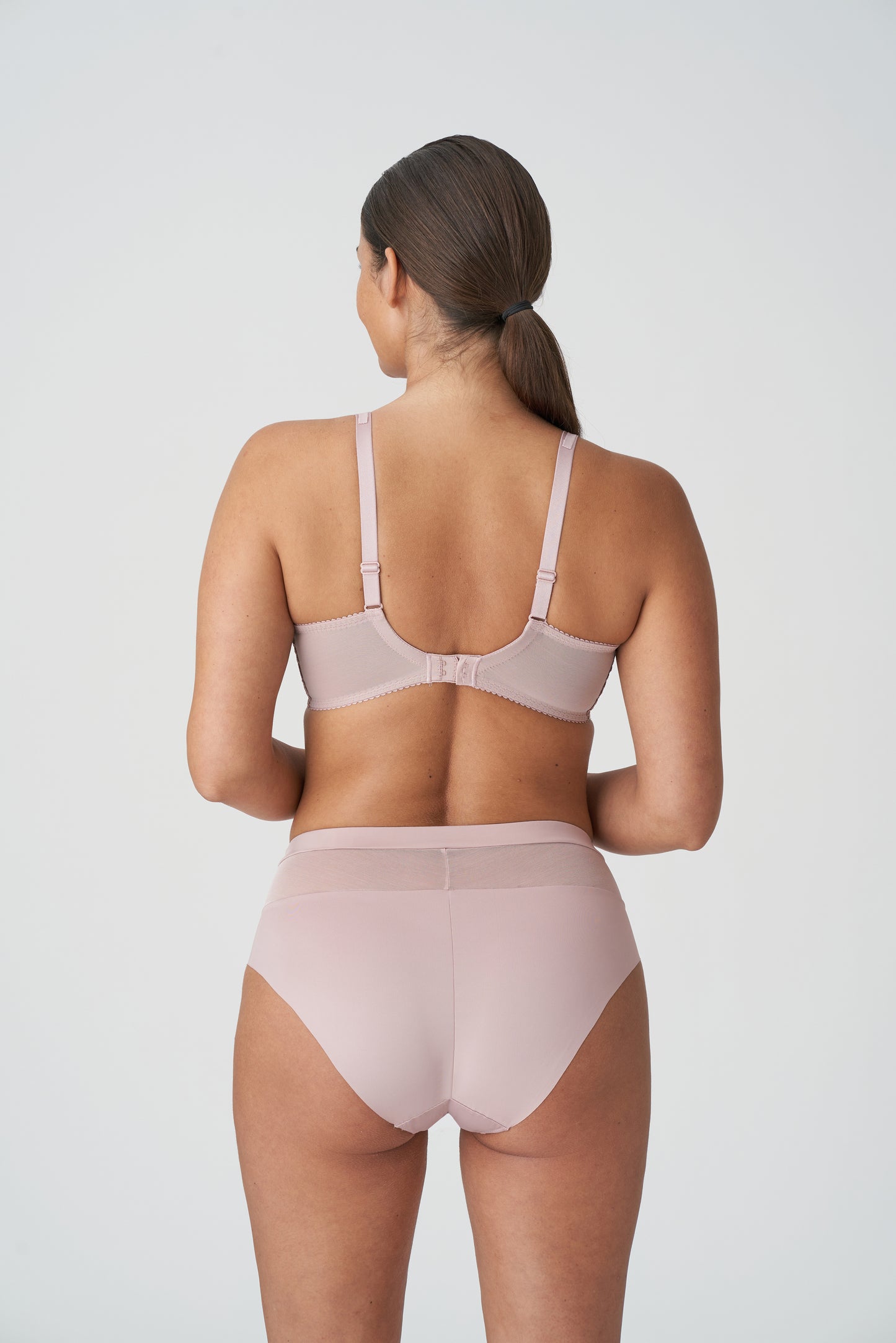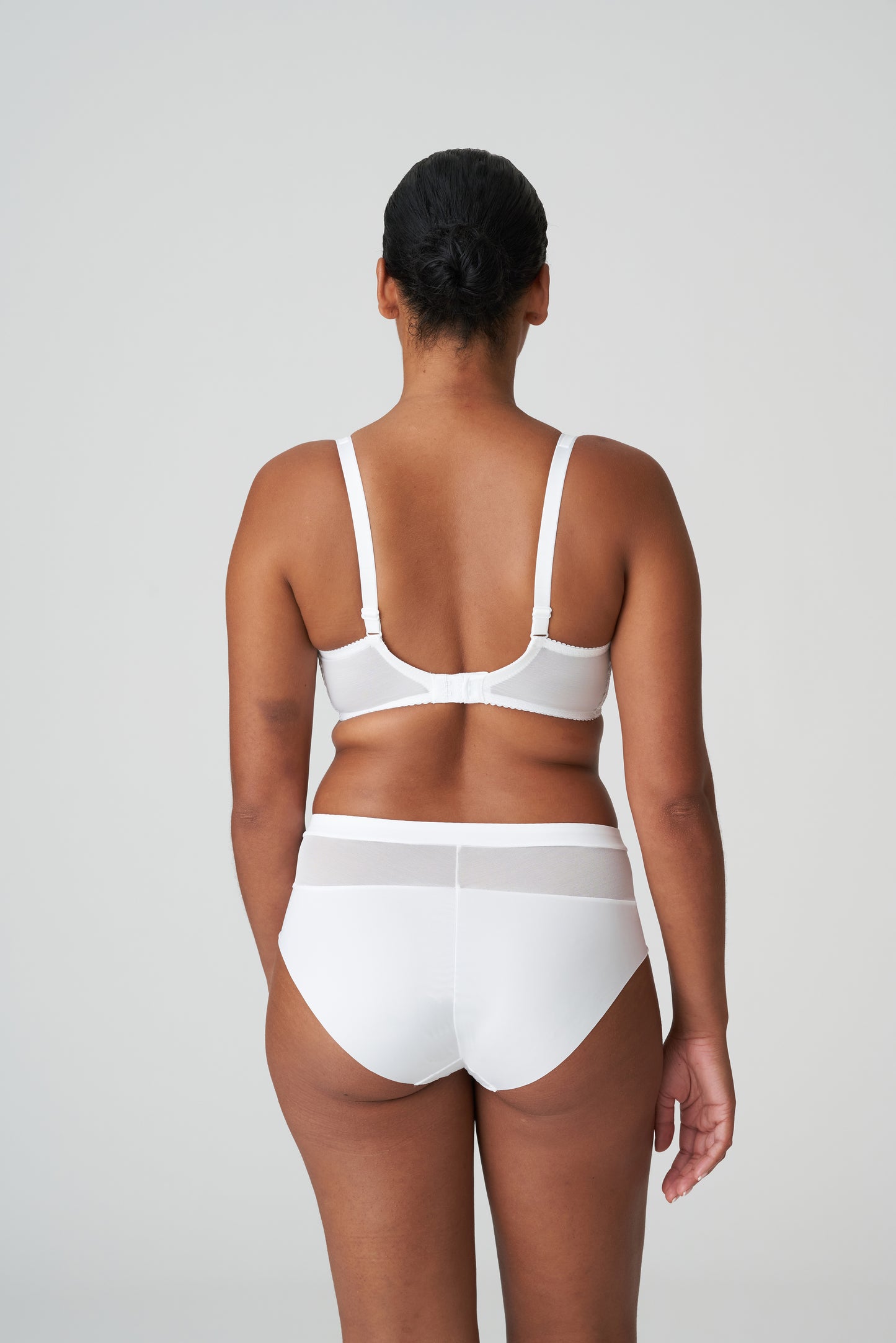 High waisted briefs with a gorgeous embroidered panel at the front and fuller coverage at the rear. A band of tulle highlights the waist.