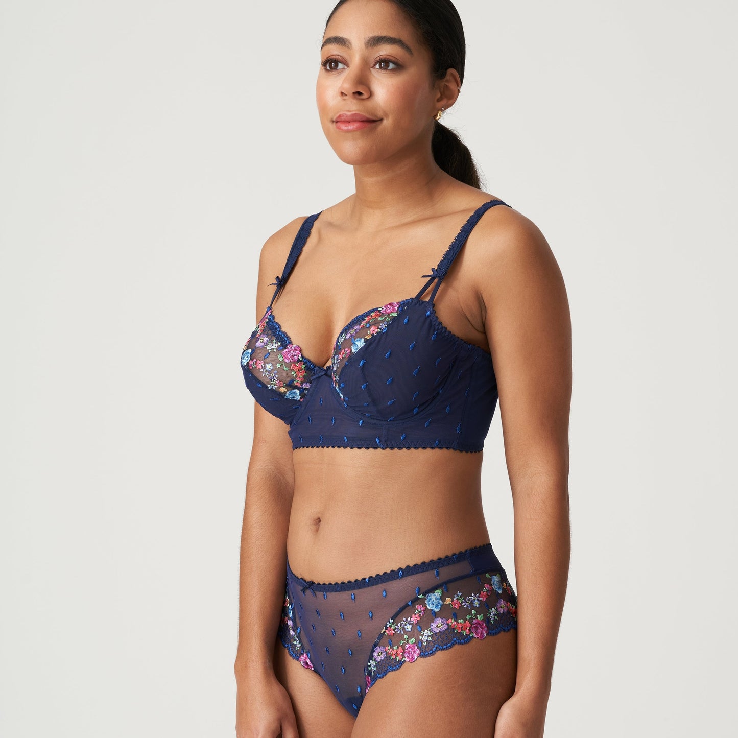 Luxury European lingerie brand Prima Donna has combined the most beautiful of fabrics with their elegant construction to form the gorgeous Sedaine collection. These beautiful briefs feature sheer navy blue tulle at the front, with the hips accentuated by a strip of floral embroidery wrapping around to the rear. The back of the brief is a skimpy, thong like cut. Pair with the matching Sedaine bra for a stunning set.