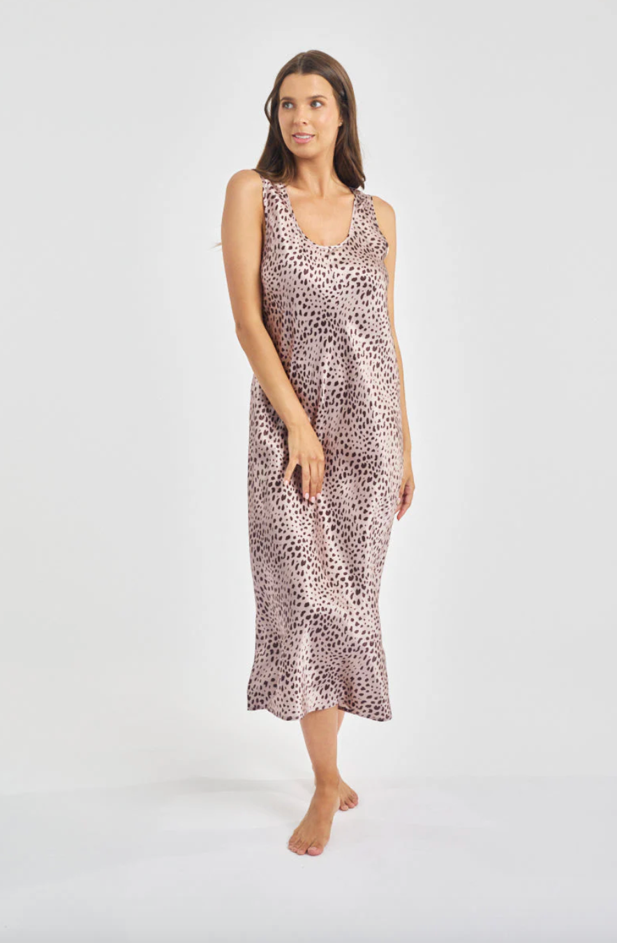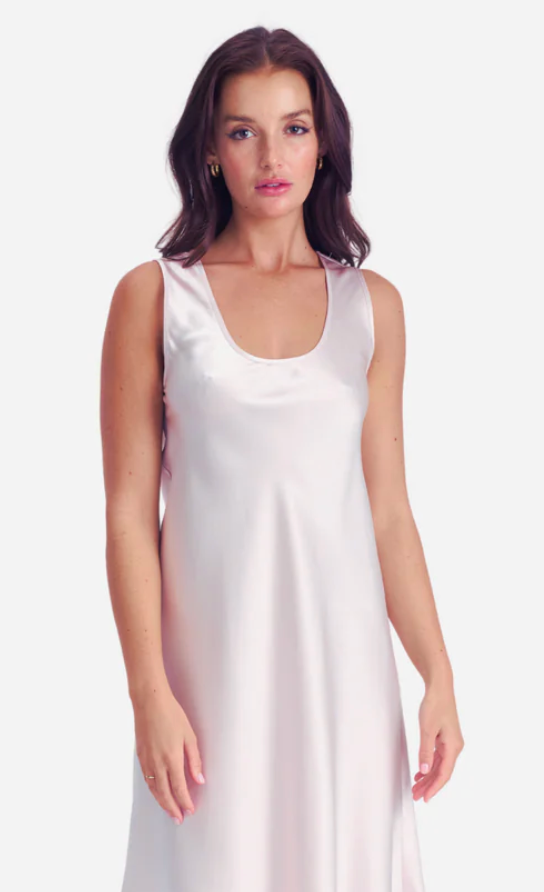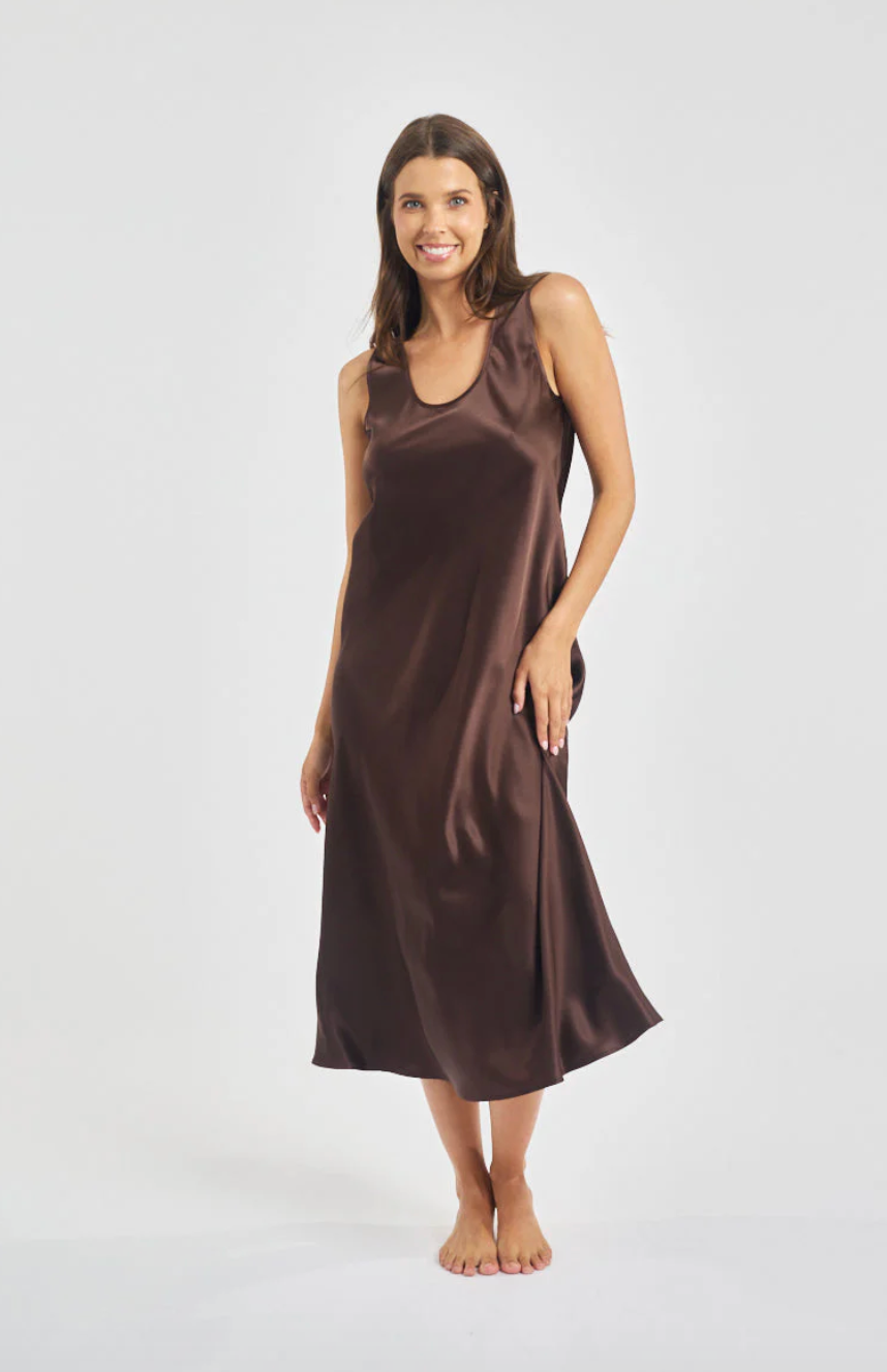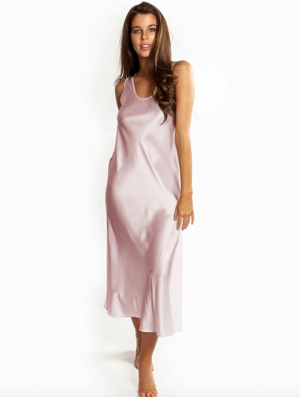 This beautiful long silk nightdress in a more modest shape, with a scoop neck and thick straps. Ideal for day or night wear.