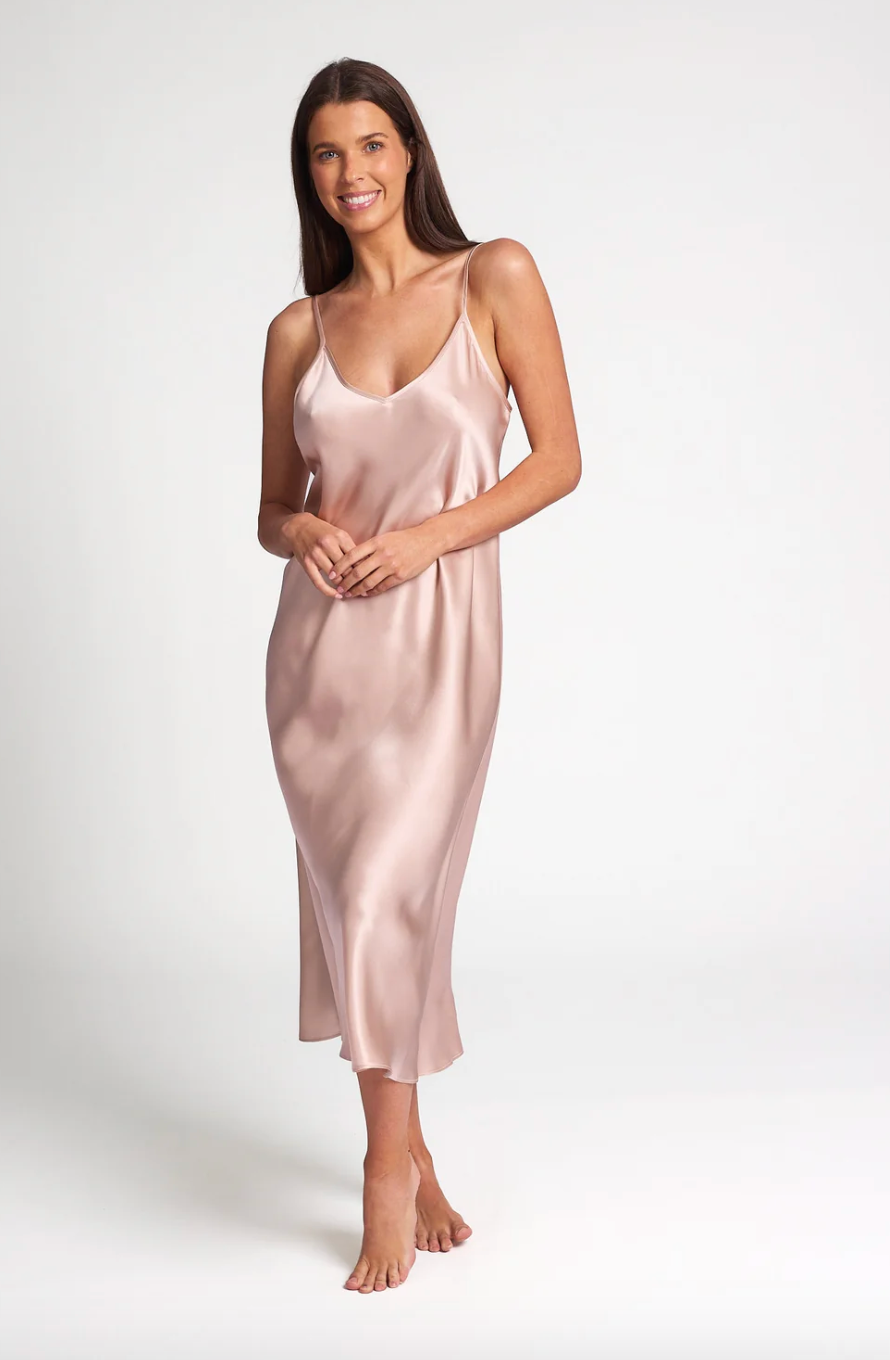 This lovely silk chemise reaches mid calf. it is cut beautifully to flatter the figure. The V neckline is simply lovely.
