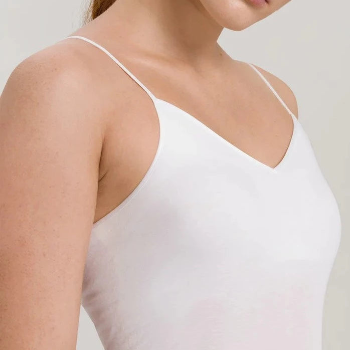 This luxurious underlayer from the Swiss brand Hanro is an absolute staple. Cut with a practical V neck and featuring adjustable spaghetti straps, you truly can wear this under anything. Features removable pads in the bust for extra versatility. Mercerised cotton ensures the singlet is smooth and soft against the skin, whilst Hanro's signature seam-free construction avoids any lines under your clothes.